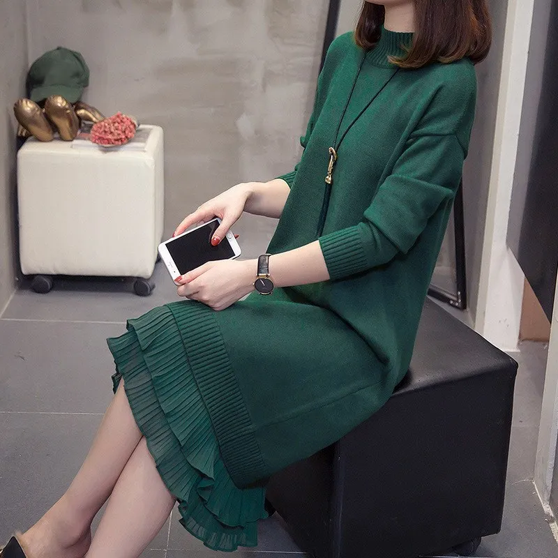 Free shipping 2019 Autumn Women Basic Midi Knitting Dress Mandarin Collar Long Sleeve Sweater Dress Casual Ruffle